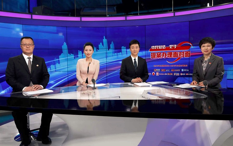 图为北京市人力资源和社会保障局党组书记、局长章冬梅(右一)做客“市民对话一把手提案办理面对面”直播访谈节目现场