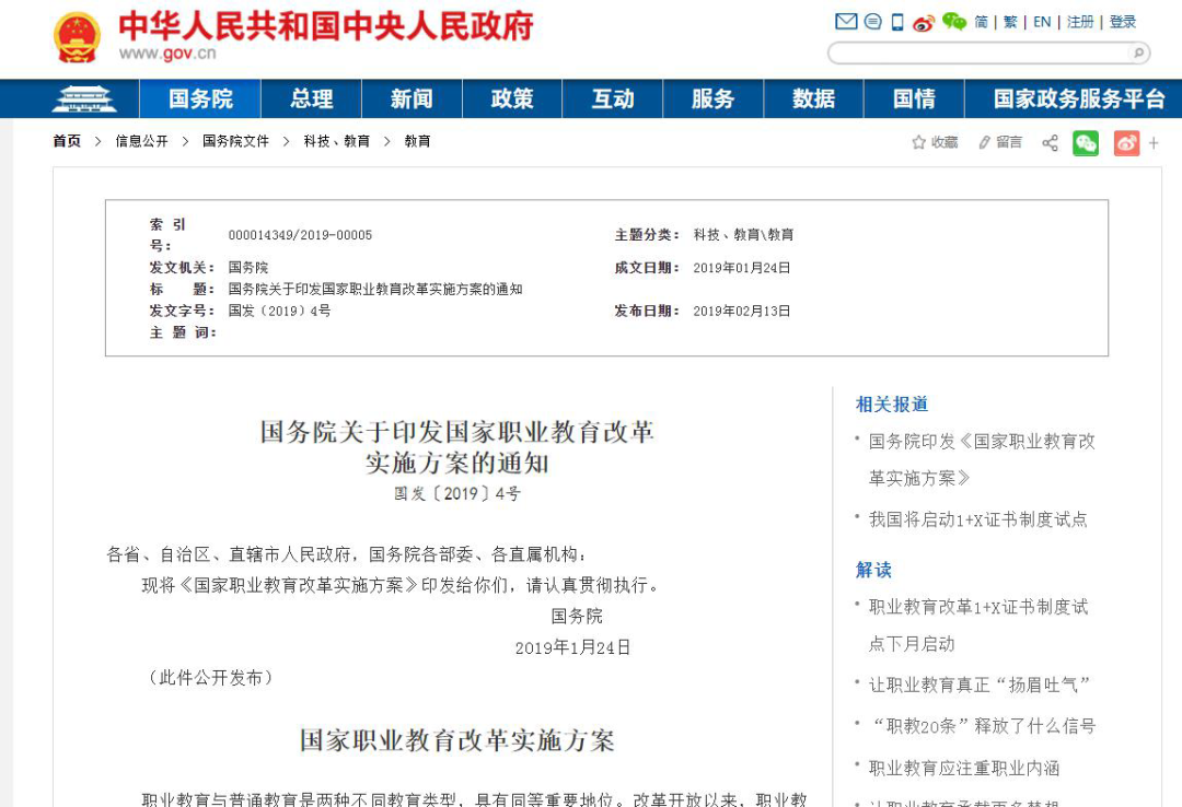 《国家职业教育改革实施方案》国发〔2019〕4号明确职业教育工作目标:把职业教育摆在教育改革创新和经济社会发展中更加突出的位置。牢固树立新发展理念,服务建设现代化经济体系和实现更高质量更充分就业需要,对接科技发展趋势和市场需求,完善职业教育和培训体系,优化学校、专业布局,深化办学体制改革和育人机制改革,以促进就业和适应产业发展需求为导向,鼓励和支持社会各界特别是企业积极支持职业教育,着力培养高素质劳动者和技术技能人才。
